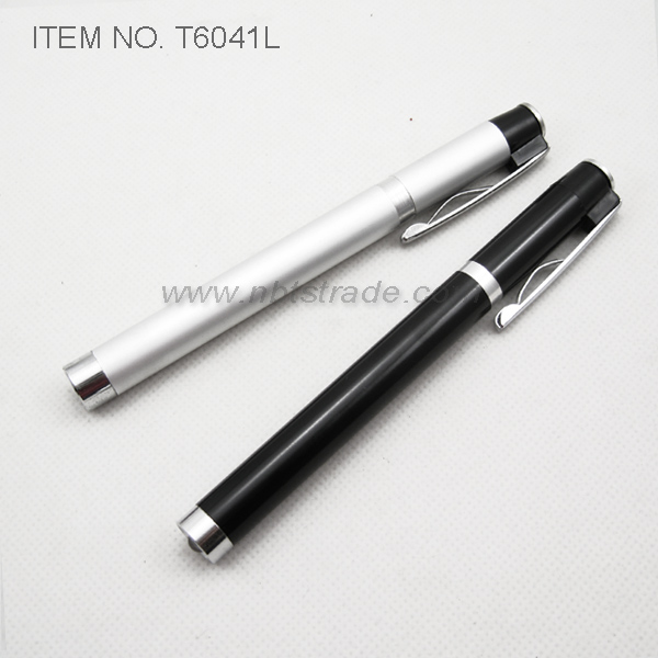 Item No. T6041LName: LED Penlight with ClipBatteries: 2 x AAASize: (L)140mmMaterial: Aluminum alloyEasy clip touch switchUse 1 PC bright white LEDProduct color can according to customer requirements