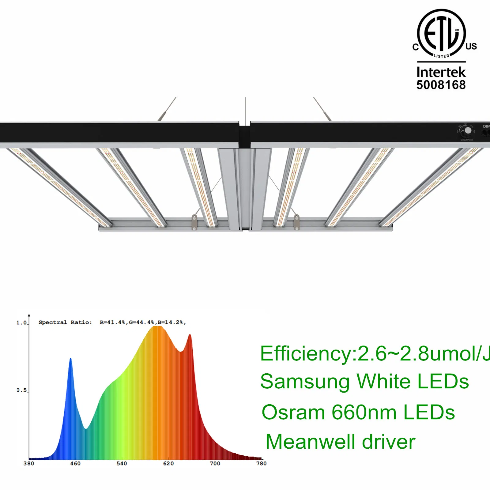 (4)We have different spectrums for customers to choose from. In the leaf period, we have a slightly more blue light spectrum, and in the flowering period, we have a more red light spectrum.